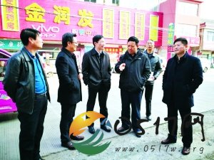 诸记录(左三)在市、县有关部门负责同志陪同下调研基层供销社建设情况,图为盱眙县桂五镇供销社调研现场。