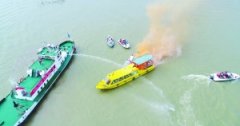 日前,洪泽区在洪泽湖南线航道5号标水域举行“洪泽湖旅游船舶水上消防救生联合演习”。 ■通讯员张建成立静...