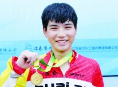 昨日,江苏省第十九届运动会自行车比赛上,淮安代表团又添1金1铜。于迁夺得男子15-16岁组20公里个人计时赛冠军,吴青秋夺得女子15-16岁组10公里个人计时赛铜牌。图为于迁。 ■记者...