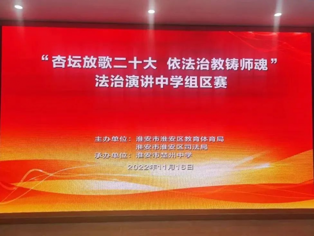 近日,在由淮安区教体局、淮安区司法局联合主办的淮安区教体系统杏坛放歌二十大 依法执教铸师魂法治演讲比赛(中学组)决赛中,淮安工业中专吴琼老师荣获中学组一等奖的好成绩...