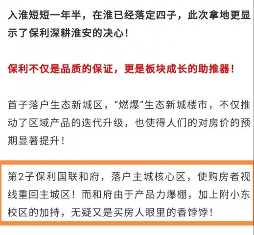 根据现行法规,房地产广告必须真实、合法、科学、准确,不得欺骗、误导消费者。记者采访中了解到,近日,微信公众号平台上一则题为《入淮一年,保利四子,和者筑善,续笔传奇...